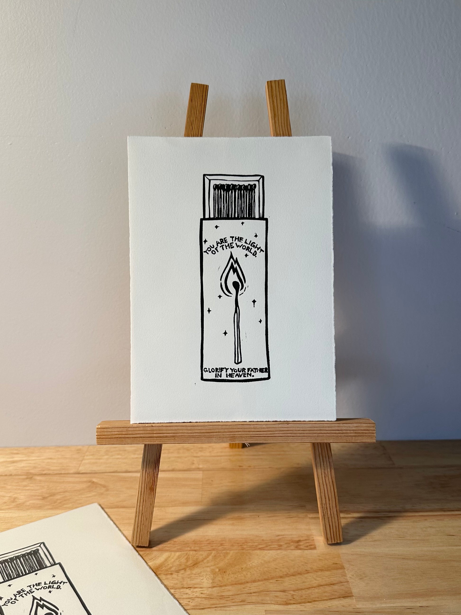 This matchbook "light of the world" design is printed on a 5"x7" piece of Rives BFK 100% cotton printmaking paper using oil based inks. This listing is for the unframed print. Please note that these are hand printed and every print varies ever so slightly.