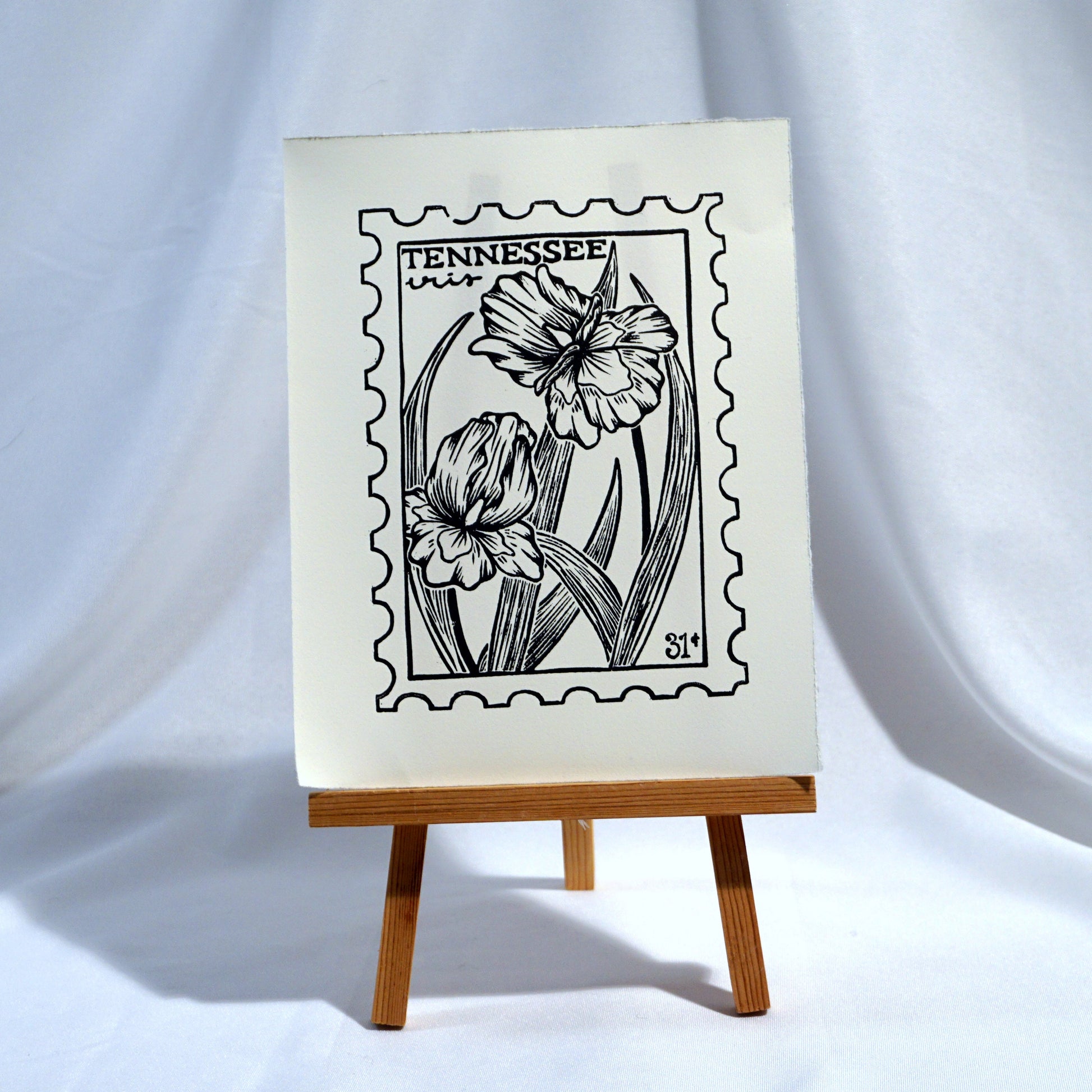 The focus of this postage stamp design is the Tennessee state flower, the Iris! This design is hand printed on a 7"x9" piece of Rives BFK 100% cotton printmaking paper using oil based inks. This listing is for the unframed print.